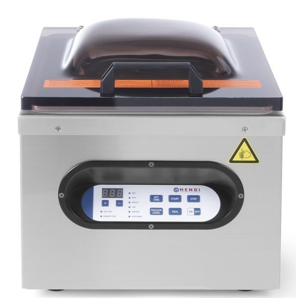 Камерный упаковщик Hendi 975398 оборудован цифровым дисплеем, который автоматизирует работу и позволяет контролировать уровень вакуума, а также регулировать время вакуумизации и запайки.