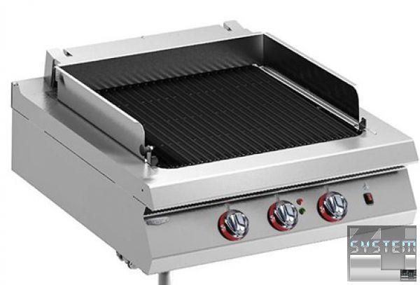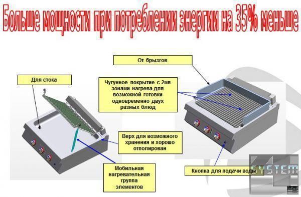 Нагрев с помощью двух наклонных независимых групп электрических элементов - ТЭНов. Электрические элементы находятся непосредственно в контакте с наклоненной чугунной решеткой, они изготовлены из нержавеющей стали AISI 309.