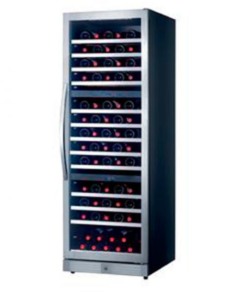 Холодильный шкаф для вина имеет три температурные зоны: верхняя с режимом от +5°С до +18°С, средняя с режимом от +5°С до +12°С, нижняя с режимом от +12°С до +18°С, что подходит для любого вида вина.