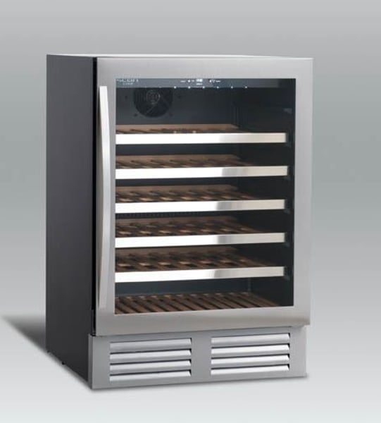 Компактный холодильный шкаф с одной дверью вмещает в себя 52 бутылки вина, которые размещаются на пяти деревянных полках.