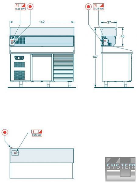 Имеются четыре варианта длины (142; 160; 207 и 259 см.) и два варианта глубины (33 и 37 см.) Gastronorm;