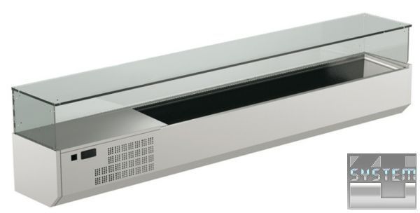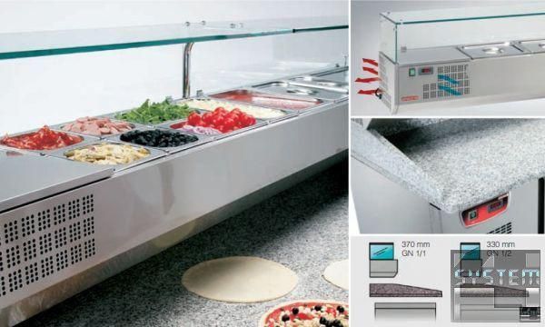 Настольные барные витрины - предназначены для кратковременного хранения и демонстрации, предварительно охлажденных продуктов (салатов, закусок, гарниров) в магазинах, кафе, барах, ресторанах, суши-барах. Наиболее широко применяются в пиццериях для хранения топпинга (начинки для пиццы).