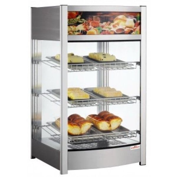 Настольная витрина для подогрева оснащена светодиодной подсветкой, нагревателем, который обеспечивает необходимую температуру от +30 до +90 °С, также имеет специальный резервуар для воды, чтобы блюдо не были подвержены усушке. Корпус витрины выполнен из нержавеющей стали, стекло - с четырех сторон, три хромированные полки, задние двери витрины распашные. Лайтбокс расположен сверху. Есть цифровой дисплей и электронный термостат. Объем 97 литров