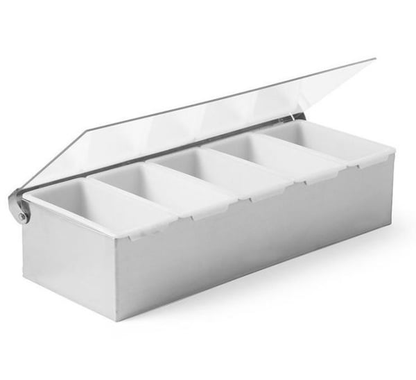 Ящик барный, выполнен из нержавеющей стали, на 5 лотков из пластика, с прозрачной крышкой из полипропилена, открывающейся вверх. Лотки в комплекте.