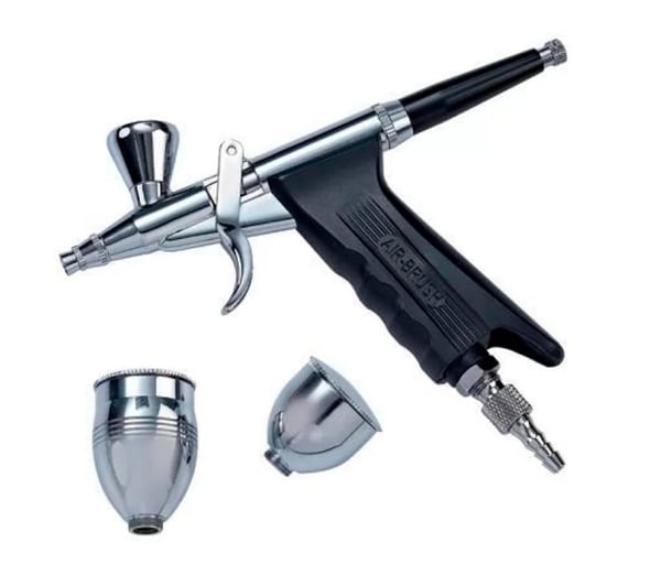 Ручний аерограф пістолет розпилювачодинарної дії з верхньою подачею фарби і трьома змінними бачками різного об'єму.