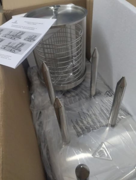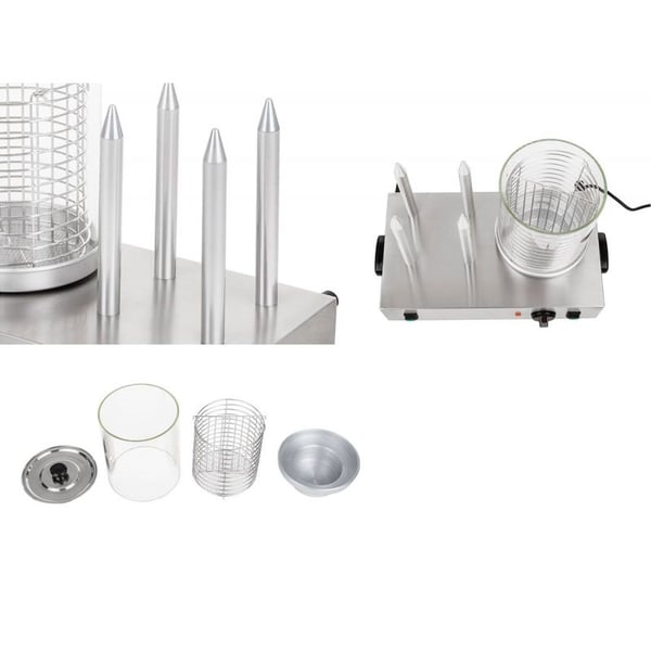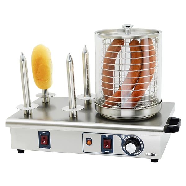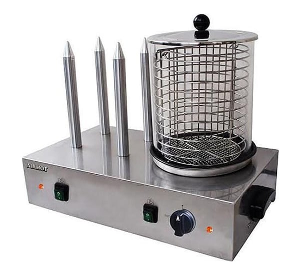 Штирьовий хот-дог апарат призначений для приготування та розігріву булочок та сосисок, а також готує на пару, що виключає розварювання сосисок та булочки мають хрумку скоринку. В апараті є дві панелі: одна використовується для зберігання готового хот-догу, а інша використовується для приготування хот-догу що і робить його унікальним. Це обладнання незамінне для фаст-фуду, дуже зручне у використанні будь-якого ресторану або кафе.