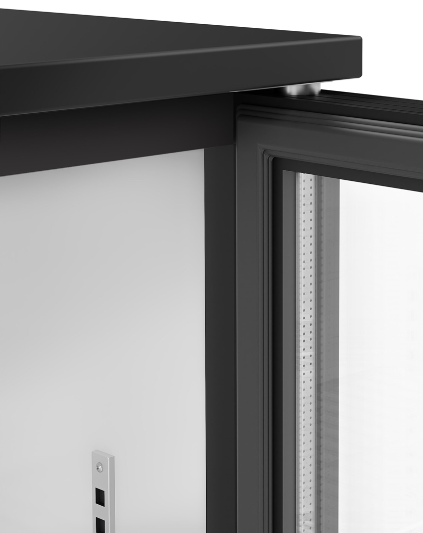 Для видимості асортименту та наповненості барного холодильника - наявні самозакривні дверцята, виконані з ударокоміцного загартованого скла.