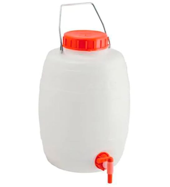 Бідон циліндричної форми білого кольору виконаний з поліетилену високої щільності HDPE, червона кришка з PP поліпропілену з прокладкою, підходить для контакту з харчовими продуктами. Обладнана ємність ручкою з оцинкованої сталі.