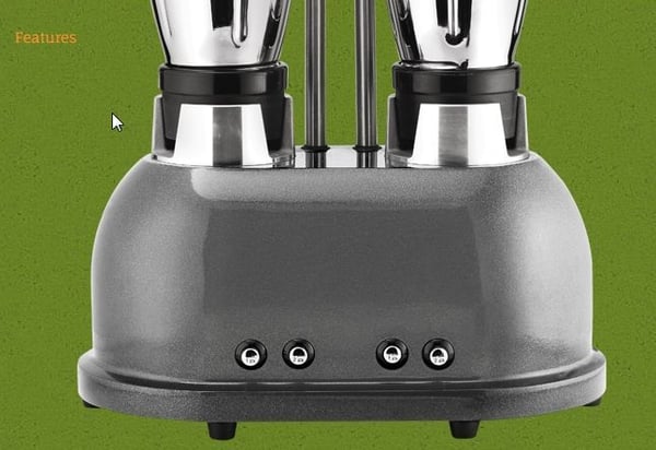 Корпус блендера виконаний з легкого алюмінієвого сплаву, спроектований так, щоб витримувати найбільші навантаження та забезпечувати максимальну стабільність кожної операції. Вузол леза, виготовлений з нержавіючої сталі, призначений для змішування, різання та подрібнення фруктів та льоду до стадії досконалості. З'єднання двигуна та ножів за допомогою унікальної муфти гума/метал усувається шум при роботі, а також здешевлюється та полегшується обслуговування. У разі зношування гумову муфту легко замінити не вдаючись до послуг спеціаліста з технічного обслуговування.
