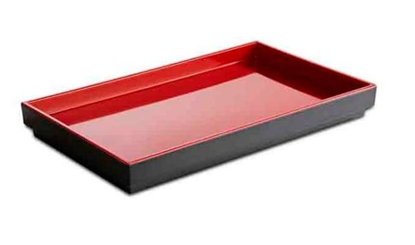 Блюдо для подачі виготовлено з меламіну знизу чорного кольору, а всередині червоного кольору розміром GN1/2.