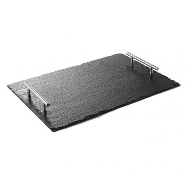 Таця виконана із сланцю, прямокутної форми, з боків розташовані ручки.