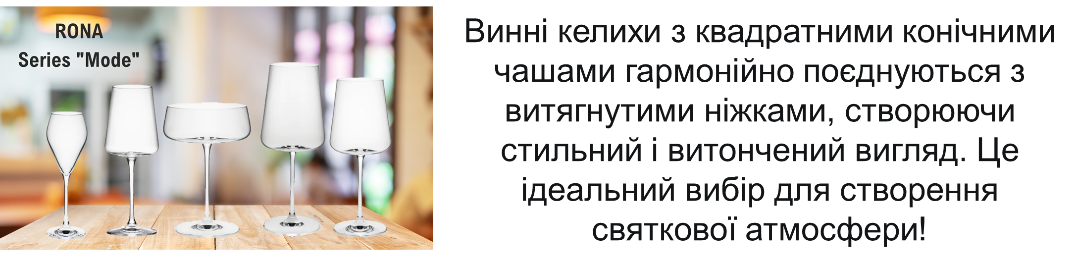 Колекція “Mode” – втілення елегантності та якості. Ці келихи – більше, ніж елементи сервірування, вони відрізняється сучасним дизайном із чіткими лініями.