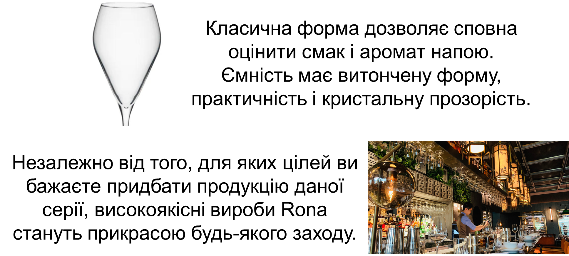 Rona – це всесвітньо визнаний виробник професійного скляного посуду зі Словаччини, відомий своєю високою якістю та бездоганною репутацією. Колекції барного скла від цього європейського бренду вирізняються витонченістю, різноманітністю декорів та форм, а також високою якістю ручної роботи. Компанія RONA має сертифікат ISO 9001, що підтверджує найвищу якість продукції за європейськими стандартами. Барне скло колекції Mode призначене для сервірування столу та відноситься до сегменту професійного посуду для ресторанів.