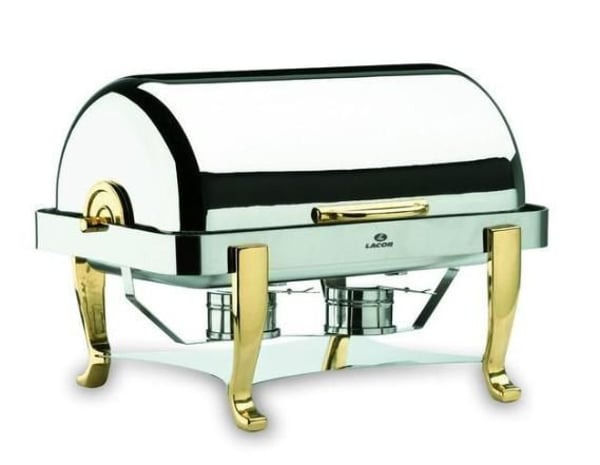 Чафіндіш для кейтерингу з дзеркальним оздобленням виконаний з високоякісної нержавіючої сталі, ніжки та ручка оздоблені позолотою, завдяки використанню високоякісного матеріалу та елегантному оздобленню.