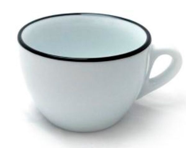 Витончена чашка в оригінальному стилі виконана з дуже міцного, стійкого до зношування та високих температур фарфору білого кольору з чорною облямівкою по обідку чашки.