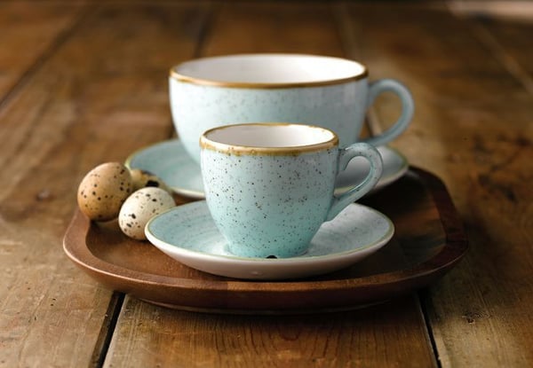 Маленька чашка для кави Churchill із серії Stonecast Duck Egg Blue. Страва зроблена з порцеляни із застосуванням кольорових глазурів.