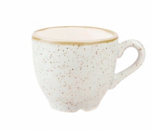 Чашка для еспресо Churchill із серії Stonecast White Speckle. Страва зроблена з порцеляни із застосуванням кольорових глазурів.