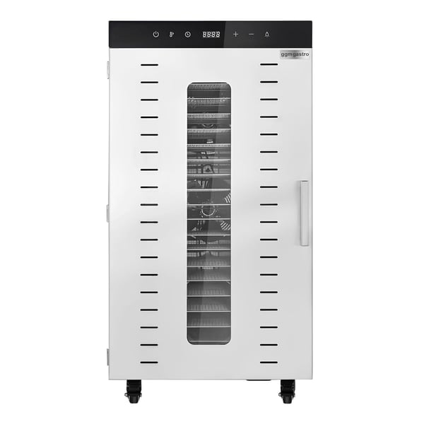 Дегідратор (сушарка) - це незамінне обладнання, призначене для прискореного сушіння фруктів та овочів, зелені, а також підійде для в'ялення м'яса та риби, грибів на кухні ресторану, кафе, бару, підприємства громадського харчування. З його допомогою можна приготувати безліч страв з натуральних інгредієнтів: овочеві і фруктові чипси, сухофрукти, сушені трави і коріння, гриби і горіхи, а також різні смачні і корисні страви від піци до пастили. Прозорі двері вигідно презентують викладку сушеного продукту, а також дозволять наочно стежити за процесом, не відкриваючи дверцята - зберігаючи внутрішній температурний режим мінідуховки.