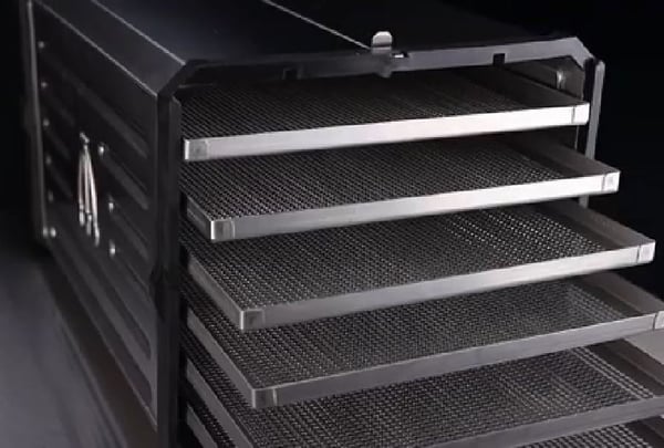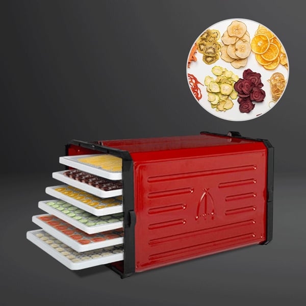 Корпус дегідратора з пофарбованої листової сталі, посилений нейлоном і оснащений 6 рівнями для сушки продуктів розміром 250х360 мм