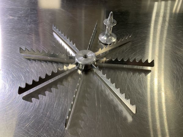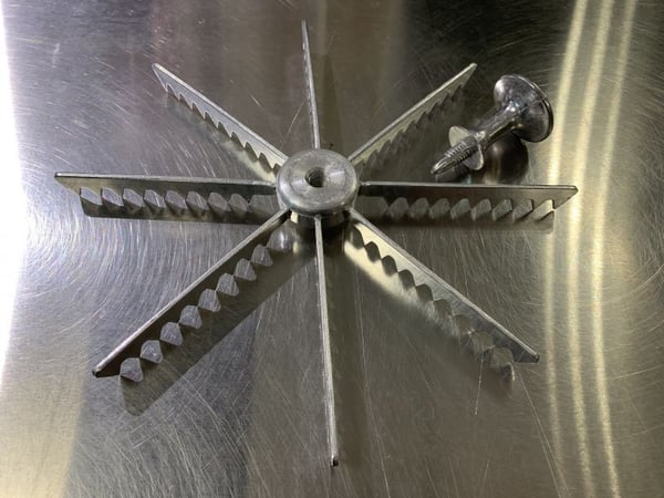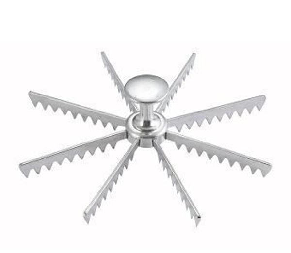 Маркер для пирогів виготовлений з литого алюмінію, має 8 важелів із 9 зубцями в кожному та знімну центральну ручку. Розмір ножа складає 100мм.
