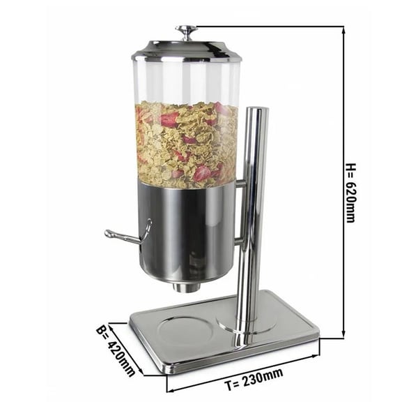 Диспенсер для мюслі GGM MSY7 призначений для дозування сипких продуктів: мюслі, пластівців, горіхів, круп і т.д. Використовується в готелях, базах відпочинку, буфетах, точках самообслуговування, фуд кортах, також буде незамінним на фуршетах, кавобрейках, бранчах, шведських столах, кейтрингу і навіть на домашній кухні.