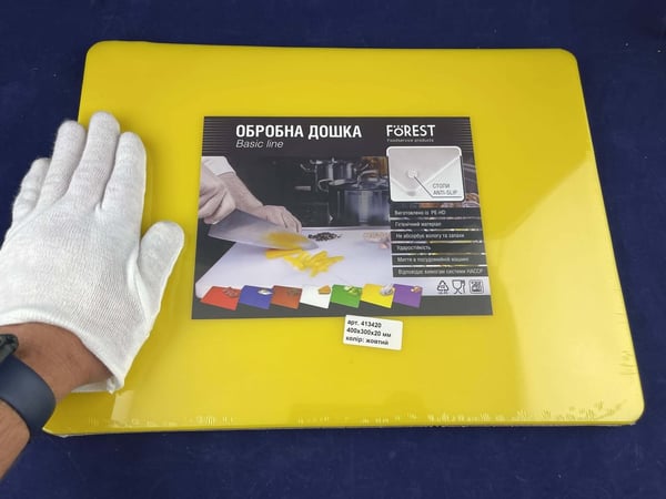 Пластикова дошка виготовлена в стандартному розмірі 400х300х20 жовтого кольору. Відповідає вимогам системи НАССР.