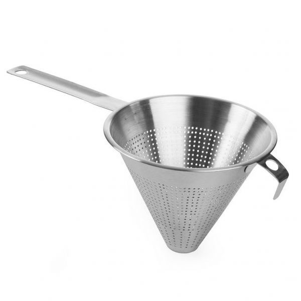 Друшляк конусний, має міцну конструкцію, цільну ручку з отвором і гачок. Матеріал – нержавіюча сталь.