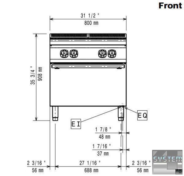 Електрична плита Electrolux E7ECEH4QE0 включає 4 квадратні конфорки 230х230 мм та потужністю 2,6 кВт. Плита має габаритні розміри: 800мм (довжина), 730мм (глибина), 850мм (висота) та важить 80кг. Пристрій живиться від трифазної мережі з напругою 400В та частотою 50 Гц. Електрична духовка на 3 рівні під GN2/1, розміром 540х650х300 мм, температурний режим роботи 140...300°С, товщина металу робочої поверхні 1,5 мм, комплект 1 грати GN2/1, нерж. сталь AISI 304.