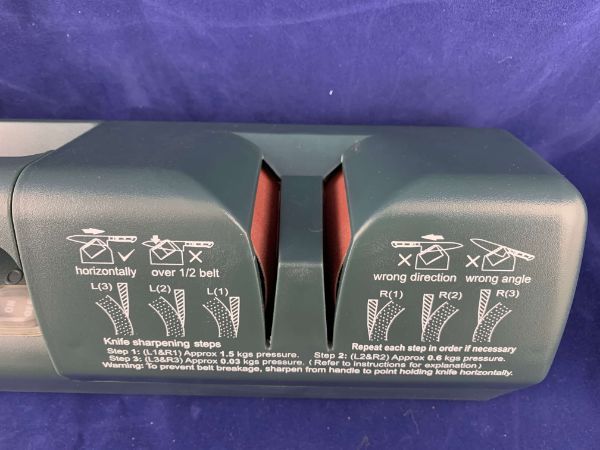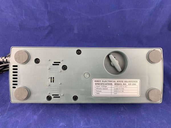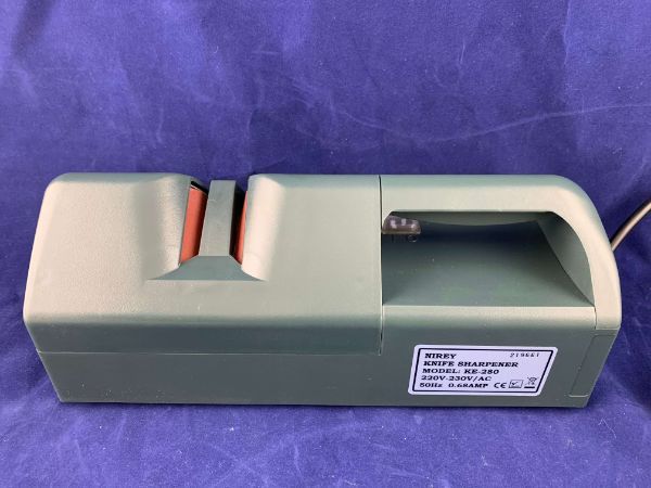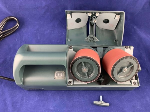 Корпус верстата для заточування ножів виконаний із якісного пластику, є кнопка включення та зручна ручка для утримання верстата у нерухомому стані. Зручна заміна дисків.