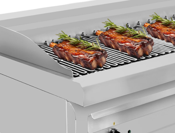 Електричний вапо-гриль - це теплове обладнання, яке ідеально підійде для приготування соковитих та корисних страв із м'яса, овочів, риби в ресторанах, кафе, точках фаст-фуд. Електричний вапо-гриль має спеціальну систему нагрівання і його принцип роботи подібний до роботи звичайного грилю на вугіллі, мангалу, однак продукти не пересушуються та не втрачають вагу в процесі приготування. Нагрівальні елементи легко мити. Їх можна підняти, що полегшує миття таці з водою та внутрішніх елементів гриля. У підносі з водою збирається весь жир, що стікає з продуктів, які готуються.