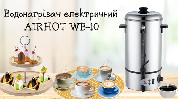 Водонагрівач AIRHOT WB-10 призначений для швидкого отримання кип'яченої води та обслуговування великої кількості людей. Кип'ятильник призначений для швидкого одержання кип'яченої води та підтримки заданої температури. Застосовується обладнання на лініях роздачі в кафе, барах, ресторанах, закусочних, їдалень, на підприємствах громадського харчування, у школах, дитячих садках, медичних закладах та офісах.
