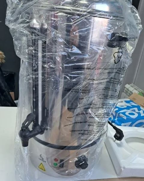 Оснащений зливним краном, термоізольованими ручками, індикатором рівня води,