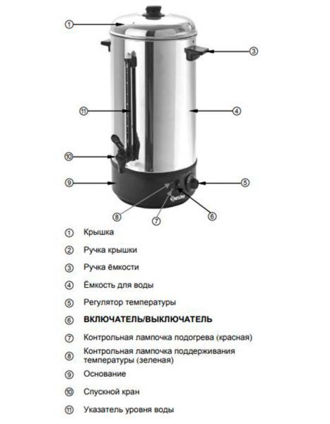 Оснащений зливним краном, виконаний з високоякісної нержавіючої сталі, термоізольовані ручки, індикатор рівня води, який розташований на передній стінці корпусу. Світловий індикатор живлення та нагрівання знаходиться на корпусі. Прихований ТЕН. Об'єм - 8,5 л.