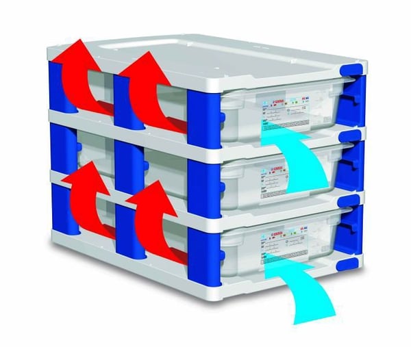 Стелаж для пластикових контейнерів Аравен забезпечує оптимальне збереження вологи у продуктах (особливо для овочів та фруктів). Свіжі фрукти та овочі мають високий вміст води. Ця перевага матиме вирішальне значення для її правильного збереження, оскільки з часом вони відокремлюються від цієї води, яка у вигляді вологи може конденсуватися на стінках та дні контейнера для харчових продуктів, викликаючи в них процес гниття. Щоб уникнути цього погіршення, пластикові контейнери, призначені для зберігання цього типу їжі, не можуть бути закриті герметично і повинні бути забезпечені вентиляційними зонами, які дозволяють видаляти випарену воду, не залишаючи конденсату. Конструкція етажерки як така служить кришкою контейнера, для гастроємності не потрібна додаткова кришка, т.к. етажерка забезпечена вентиляційними зонами для швидкого припливу повітряних потоків для охолодження продуктів. При цьому зберігається охолодження за адекватної температури і це перешкоджає накопиченню вологи всередині, запобігаючи росту плісняви. Крім того, розташування ґрат Araven GastroNorm на дні контейнера також дозволить здійснювати циркуляцію повітря через дно, при цьому запобігаючи конденсації в цій точці.