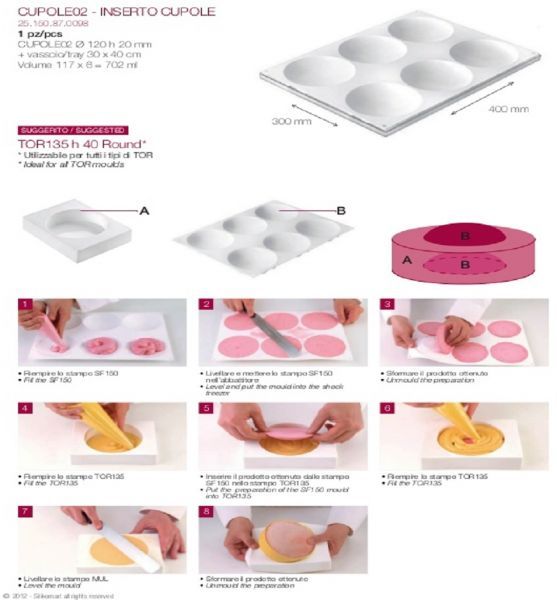 Силіконові форми Silikomart виготовлені з рідкого силікону LSR, який гарантує більшу стабільність та термічну міцність у порівнянні з іншою силіконовою сировиною; як мінімум 3000 використань (випікання або заморожування); термічна стійкість (широкий діапазон температур від - 60 ° C до + 230 ° C). Тільки форми Silikomart піддаються термічній обробці, яка триває в середньому 6-7 годин, гарантуючи повне усунення будь-яких токсичних речовин. Належить до професійного кондитерського інвентарю для ресторанів.
