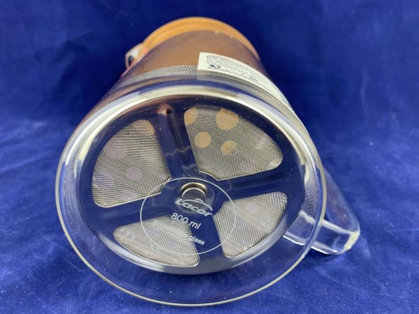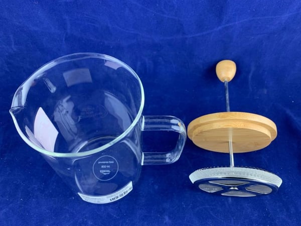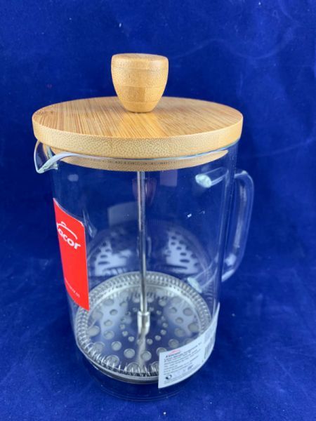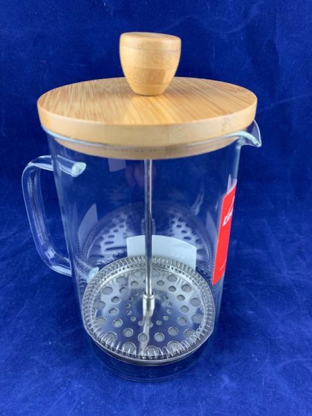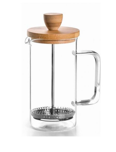 Виготовлений з боросилікатного скла, завдяки чому має чудову термостійкість і підвищену міцність ударів у порівнянні зі звичайним склом, і доповнений елегантною бамбуковою кришкою. Матеріал преса – нержавіюча сталь.