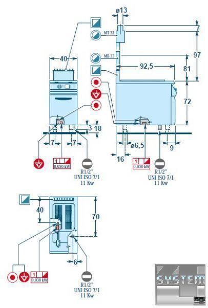 Нагрев трубчатыми горелками из нержавеющей стали AISI 304, расположенными в ванной. Горелкой управляет термостатический клапан с пилотом и пьезоэлектрическим воспламенением.