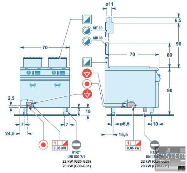 Газовая напольная отдельностоящая фритюрница Angelo Po 1G1FR4GD на две емкости по 12 л каждая относится к тепловой модульной линии GAMMA 700. Поверхность из 18-10 нержавеющей стали, толщиной 12/10 мм.