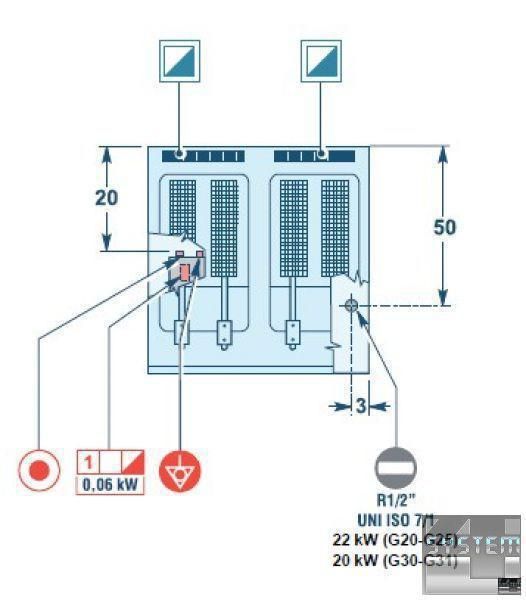 Нагрев трубчатыми горелками из нержавеющей стали, расположенными в ванной (специальной формы). Горелкой управляет термостатический клапан с пилотом и пьезоэлектрическим воспламенением.