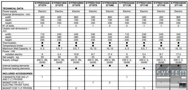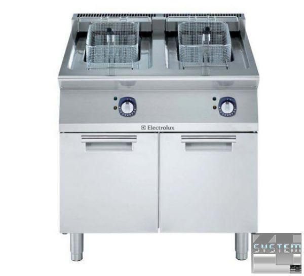 Електрична фритюрниця Electrolux e7freh2ff0 має дві ванни об'єм по 14 Lt маx та 12 л min. Регулювання температури 105-185 ° С, глибока холодна зона, термостат безпеки, отвір для зливу олії, в комплекті з двома кошиками, виконання на закритій основі, товщина металу робочої поверхні 1,5 мм. Фритюрниця має габаритні розміри: 800мм (довжина), 730мм (глибина), 850мм (висота) та важить 81кг. Пристрій живиться від трифазної мережі з напругою 400В та частотою 50 Гц.