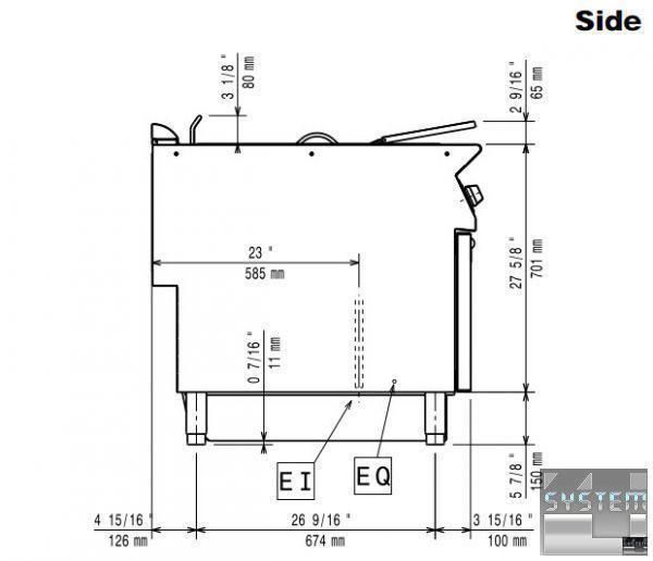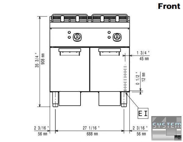 Електрична фритюрниця Electrolux e9freh2jf0 має дві ванни об'ємом по 23л max і 21л min. Внутрішні нагрівальні елементи, регулювання температури 105...185°С, глибока холодна зона, термостат безпеки, інфрачервоні нагрівальні елементи , в комплекті з 4-ма кошиками 1/2, кришкою та контейнером для збирання жиру, виконання на закритій основі. Робоча поверхня завтовшки 2мм з нерж. харчової сталі AISI304 з поліруванням Scotch Brite . Фритюрниця з базою має габаритні розміри: 800мм (довжина), 930мм (глибина), 850мм (висота) та важить 115кг. Пристрій живиться від трифазної мережі з напругою 400В та частотою 50 Гц.