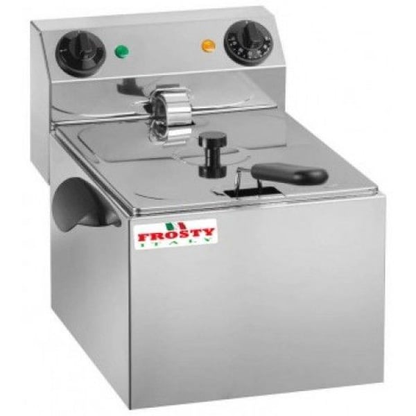 Настільна фритюрниця виготовлена з нержавіючої сталі, оснащена світловими індикаторами роботи. крана для зливу олії. Дана модель з однією ванною на 6 літрів, місткість кошика становить 0,8 кг, складається з ємності, яка щільно накривається кришкою, блоку керування та знімного кошика, робоча температура олії від +60 до +200°C. Пасерування продуктів здійснюється в сітчастому кошику зі сталевого дроту. Кошик має стійку до високих температур ручку та гачки, за допомогою яких вона підвішується на скобу для стікання олії. Час для розігріву їжі складає 18 хвилин, а на приготування потрібно 7 хвилин. Знімні ємності легко і швидко знаються, що значно полегшує догляд за ними і дозволяють без зусиль проводити санітарну очистку після використання фритюрниці. Напруга 220В, потужність 3,25 кВт.