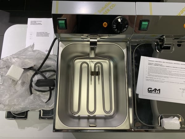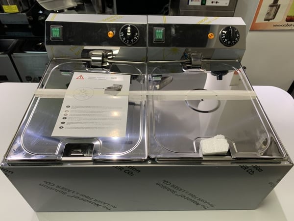 Двопостова фритюрниця складається з ємностей, які щільно накриваються кришкою, знімного кошика та блоку управління. Сталевий міцний кошик обладнаний термоізольованою ручкою. Апарат легко розбирається для санітарної обробки. Корпус виконаний із високоякісної нержавіючої сталі.