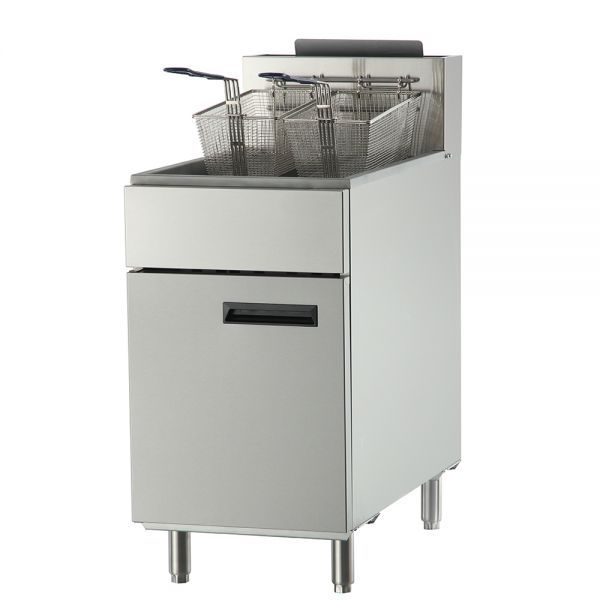 Газова фритюрниця обладнана спеціальною шафкою з дверцятами, в якій можна зберігати різноманітне кухонне начиння. Двері укомплектовані ергономічною ручкою та петлями з правого боку.