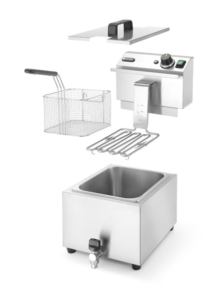 Фритюрниця Hendi 209202 - професійний кухонний апарат, який дозволить обсмажити різноманітні кулінарні вироби шляхом занурення їх у великий об'єм гарячої олії. В результаті приготування, страва набуває хрумкої золотистої скоринки, при цьому зберігає достатньо вологості і виходить особливий ароматний смак. Даний апарат використовують у кафе, барах, ресторанах та фаст-фудах для приготування одразу двох різних страв: чипсів, картоплі фрі, грибів, овочів, м'яса, риби (у клярі та без нього), курячих ніжок та крилець, біляшів, пончиків, пиріжків.