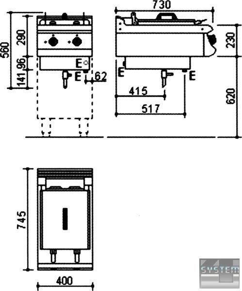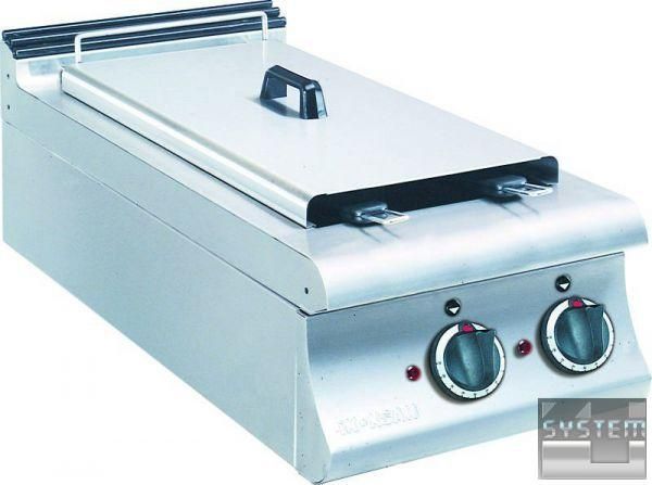 Зроблена із сатинованого хромонікелевого листа 18/8 н/с. Дротові кошики придатні для процесу смаження, покриті відповідно до умов охорони здоров'я та оснащені рукояткою для захисту від розжарювання. Маслозбірник із зоною охолодження призначений для збору згорілої олії та опадів. Нагрівальні елементи, що перекидаються, призначені для зручного чищення та технічного обслуговування і розташовані з урахуванням рівномірного поширення тепла. При підвищеній опірності система безпеки припиняє операцію. Основний перемикач призначений для подачі чи вимкнення енергії. Температура регулюється за допомогою термореле в межах 100-180 °C. Усі електричні прилади відповідають міжнародним стандартам. Обмежувальний термостат безпеки припиняє подачу енергії у разі виникнення небезпеки. Кінцева частина термостатів, що стикається з маслом, зроблена з хромонікелевої сталі. Знизу розташований кульовий клапан 3/4" для зливу олії з резервуару. Багатофункціональне використання з шафою або на консолі для установок ізольованого типу.