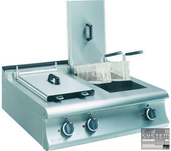 Зроблена із сатинованого хромонікелевого листа 18/8 н/с. Дротові кошики придатні для процесу смаження, покриті відповідно до умов охорони здоров'я та оснащені рукояткою для захисту від розжарювання. Маслозбірник із зоною охолодження призначений для збору згорілої олії та опадів. Нагрівальні елементи, що перекидаються, призначені для зручного чищення та технічного обслуговування і розташовані з урахуванням рівномірного поширення тепла. При підвищеній опірності система безпеки припиняє операцію. Основний перемикач призначений для подачі чи вимкнення енергії. Температура регулюється за допомогою термореле в межах 100-180 °C. Усі електричні прилади відповідають міжнародним стандартам. Обмежувальний термостат безпеки припиняє подачу енергії у разі виникнення небезпеки. Кінцева частина термостатів, що стикається з маслом, зроблена з хромонікелевої сталі. Знизу розташований кульовий клапан 3/4" для зливу олії з резервуару. Багатофункціональне використання з шафою або на консолі для установок ізольованого типу.