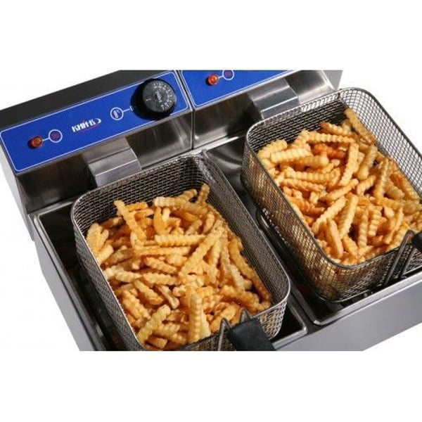 Фритюрниця з двома ваннами – це професійне кухонне обладнання, яке дозволяє обсмажувати різноманітні кулінарні вироби шляхом занурення їх у великий об'єм гарячої олії. В результаті приготування страва набуває хрумкої золотистої скоринки, при цьому зберігає достатньо вологості і виходить особливий ароматний смак.