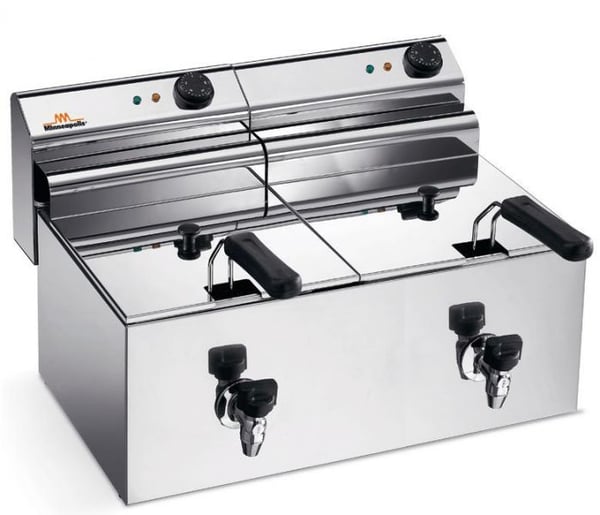 Фритюрниця з двома ваннами – це професійне кухонне обладнання, яке дозволяє обсмажувати різноманітні кулінарні вироби шляхом занурення їх у великий об'єм гарячої олії. В результаті приготування, страва набуває хрумкої золотистої скоринки, при цьому зберігає достатньо вологості і виходить особливий ароматний смак.