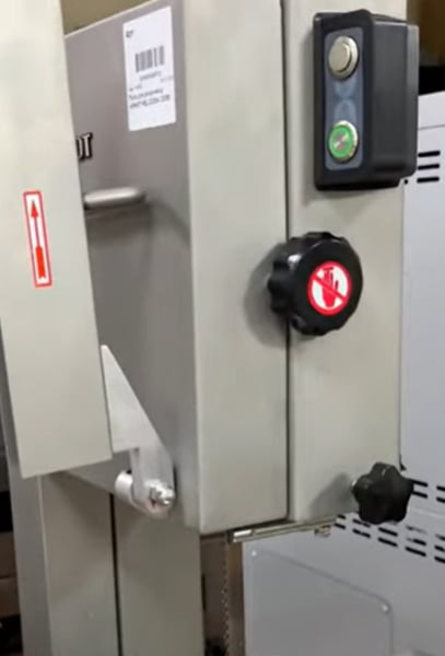 Пила для м'яса безпечна в експлуатації, завдяки наявності аварійної кнопки, мікровимикача на кришці пили та механічного штовхача для м'яса.